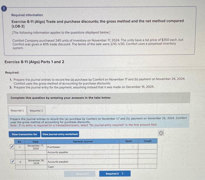Prepare the journal entries to record the (a) purchase by comfort on november 17 and (b) payment on november 26,2024. The company paid a 50%.