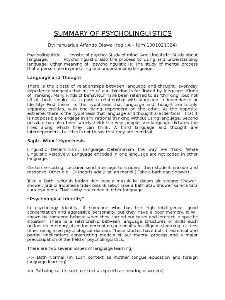 Summary of Psycholinguistics PDF Perception Aphasia