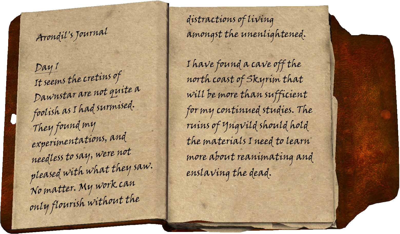 Skyrim in which the dragonborn must find the four volumes of arondil's journal in. Arondil's account of moving into yngvild to study necromancy. Day 1.