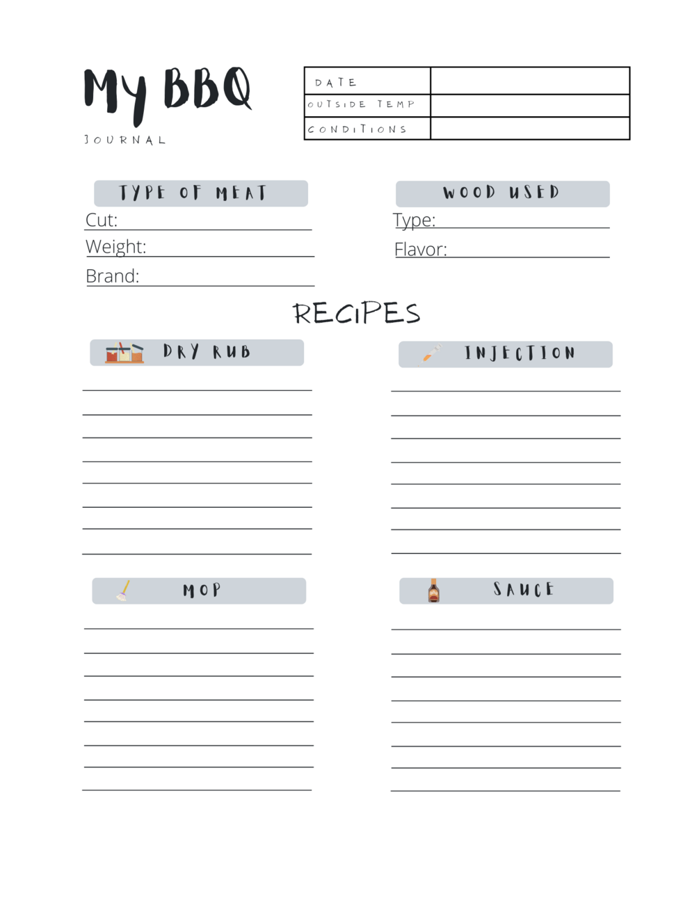 There are plenty of details such as time on and off the smoker, target temp, weight, which charcoal and. Bbq prepsheet | bbq journal | bbq schedule | printable pdf digital download. Automatically generated shopping list that you can edit and share with a friend. All of the recipes you learn in this course can also be directly imported into the.