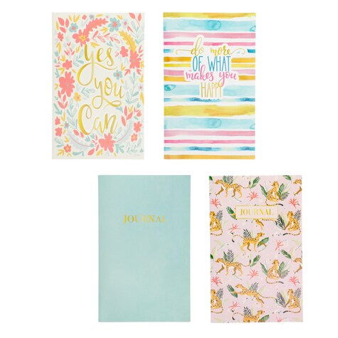 One hard cover spiral notebook with 240 ruled pages, glitter treatment on cover & printed end sheets (6 x 8.5) three soft cover journals with..
