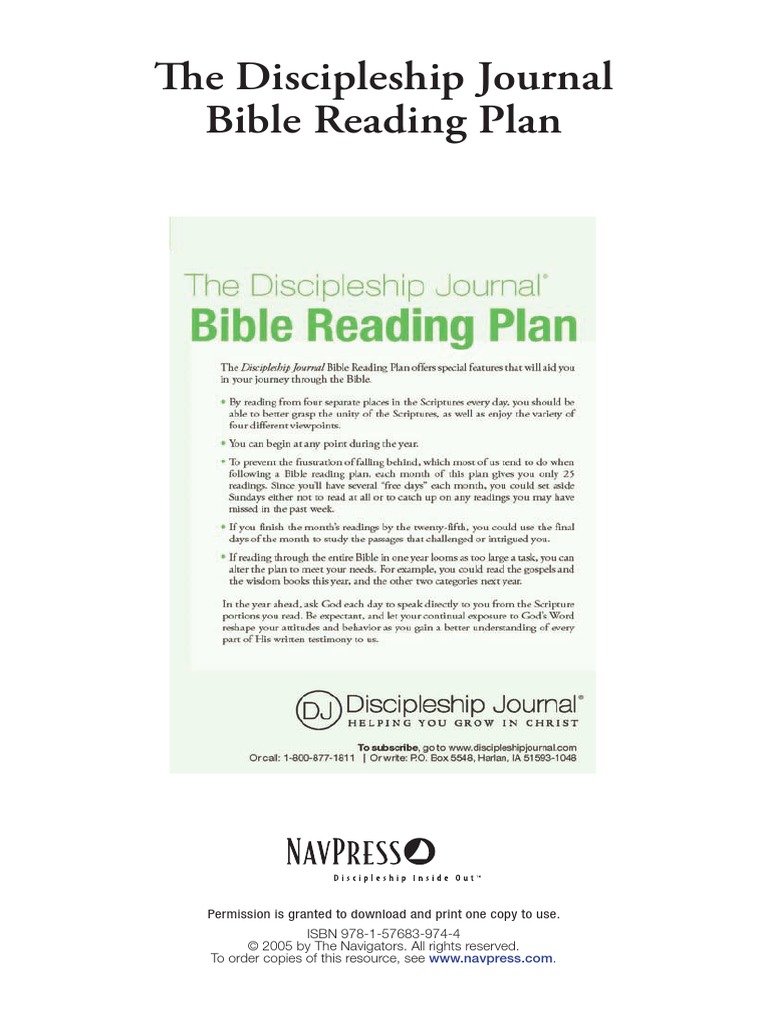 This plan will take you through one chapter each day. Web discipleship journal reading plan. Web the bible reading plan that i have used more than any other over the years, and that i used right up to the end of 2017, is the discipleship journal bible reading. Web discipleship journal reading plan sample.