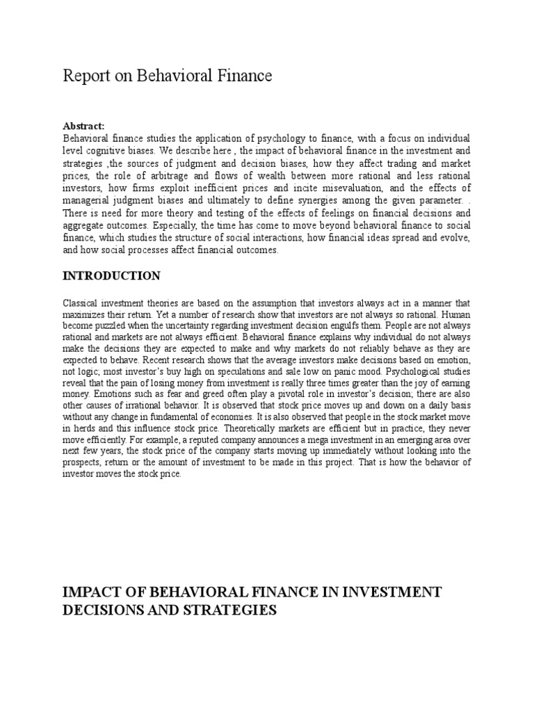 Report On Behavioral Finance PDF Behavioral Economics Investor