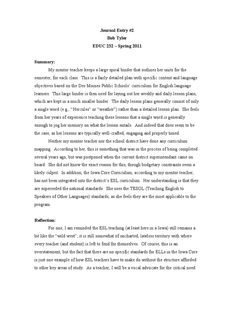 Journal Entries English As A Second Or Foreign Language Educational