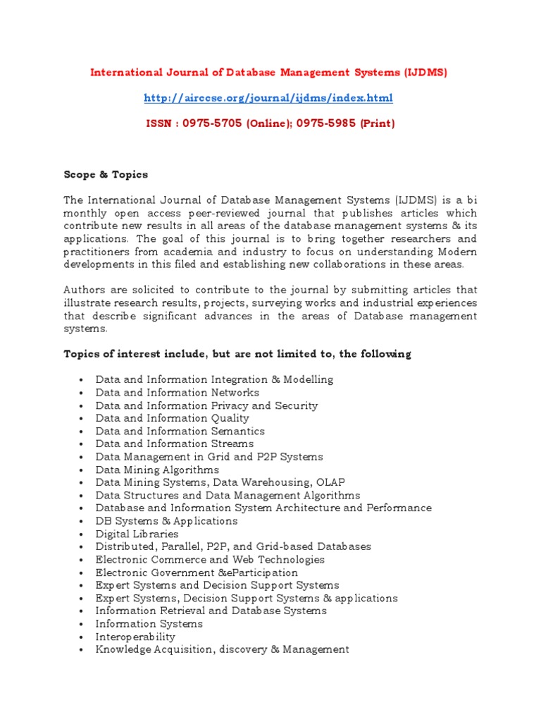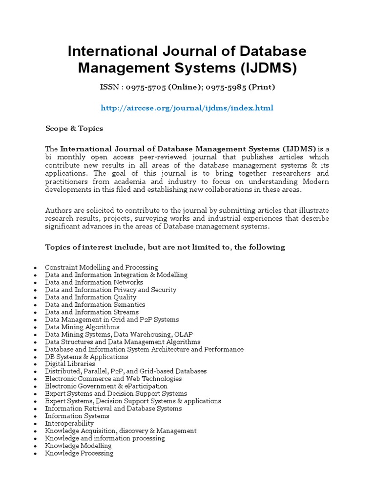 The journal of database management (jdm) publishes original research on all aspects of database management, design science, systems. Web volume 26, issue 1. Web journal.