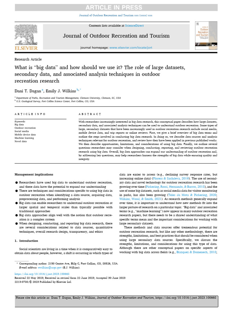 The goal of this paper is to describe the role of large datasets, secondary data, and associated analysis techniques in outdoor recreation. Web scimago journal.