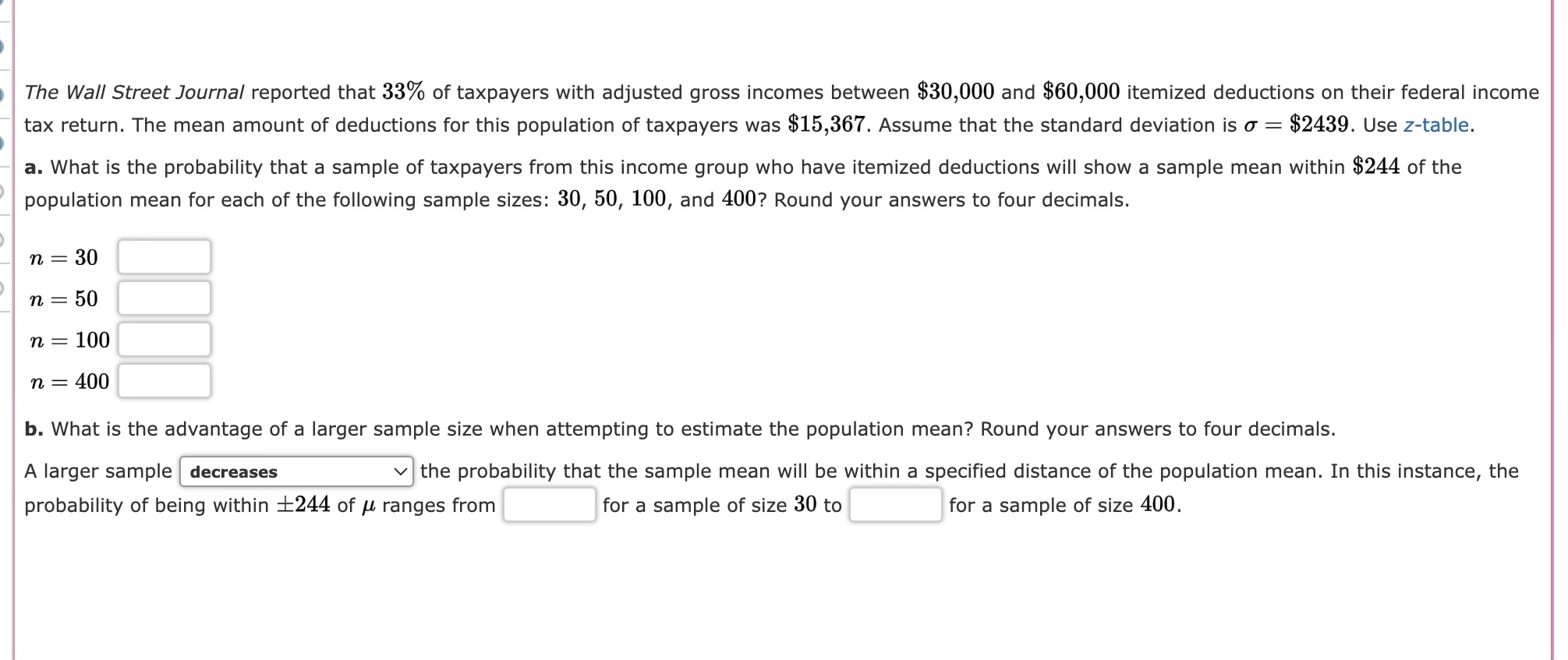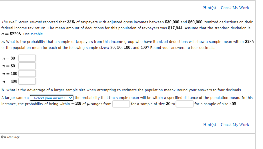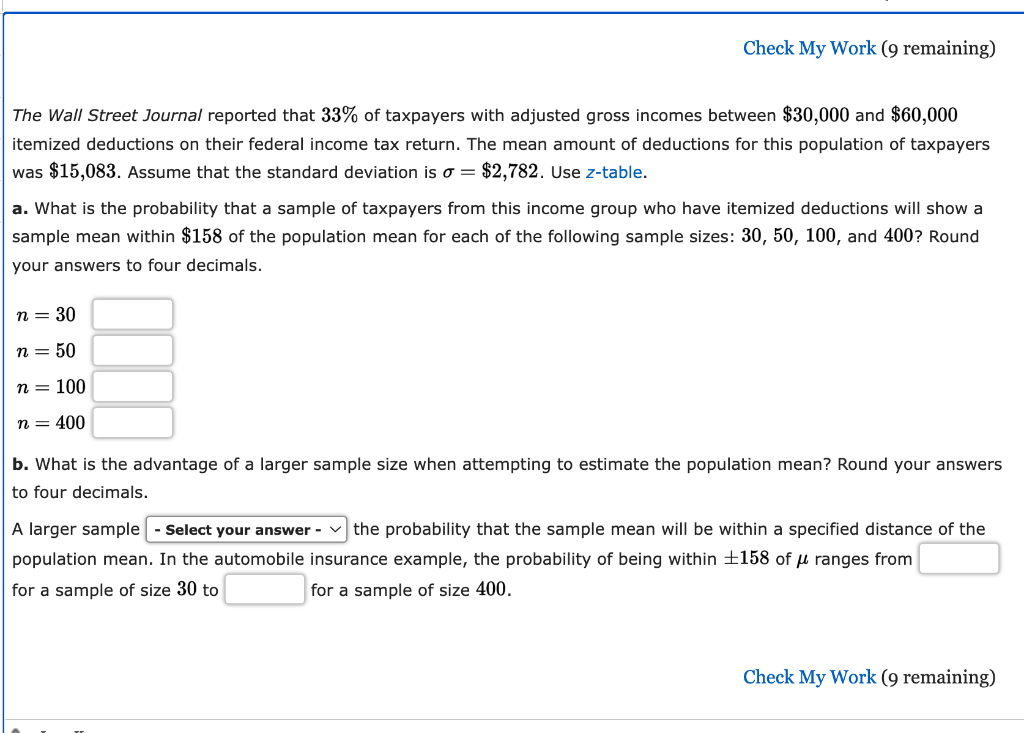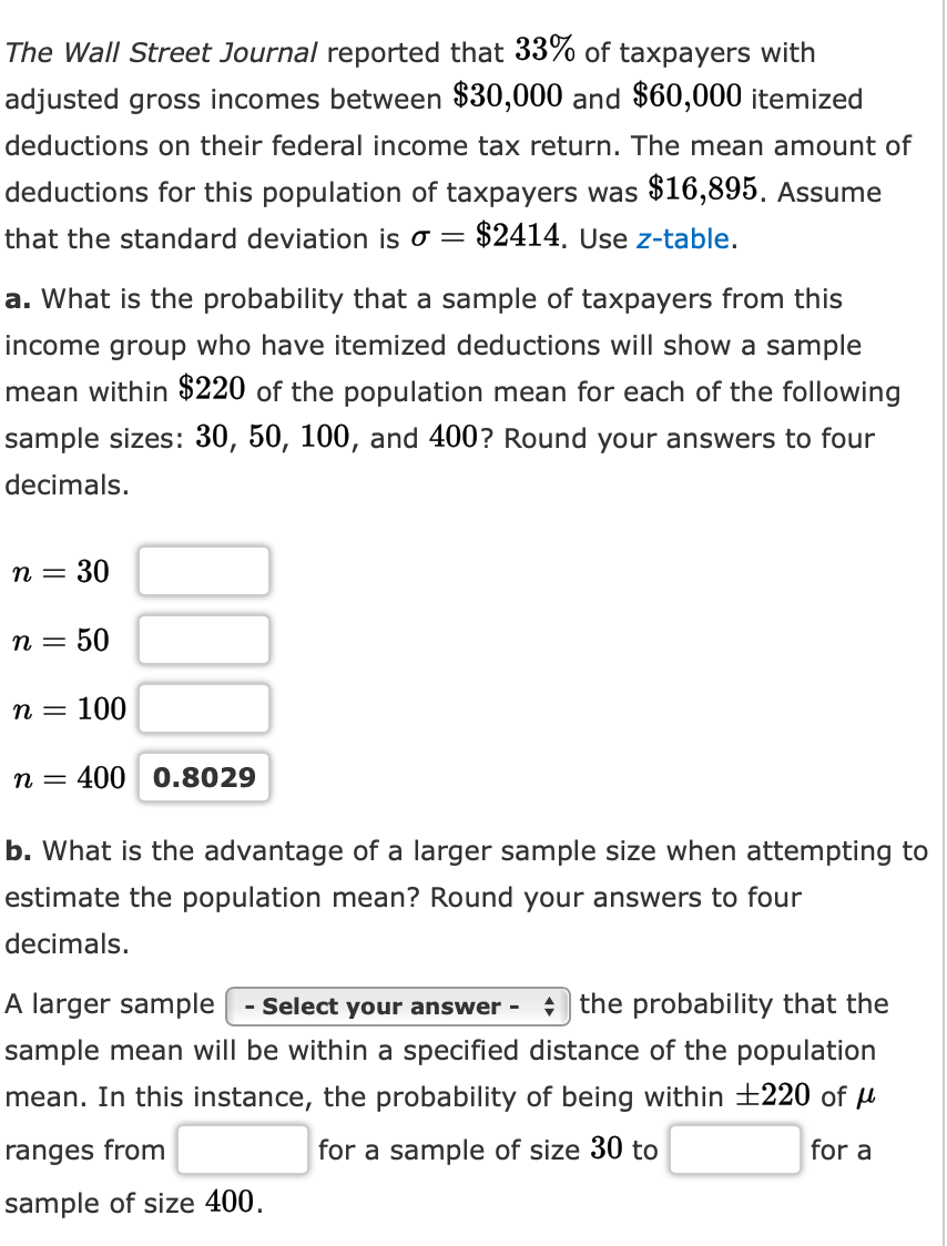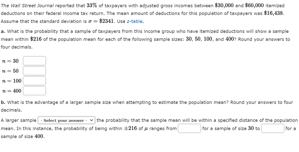 Web statistics and probability questions and answers. Web the wall street journal reported that 33% of taxpayers with adjusted gross incomes between $30,000 and $60,000.