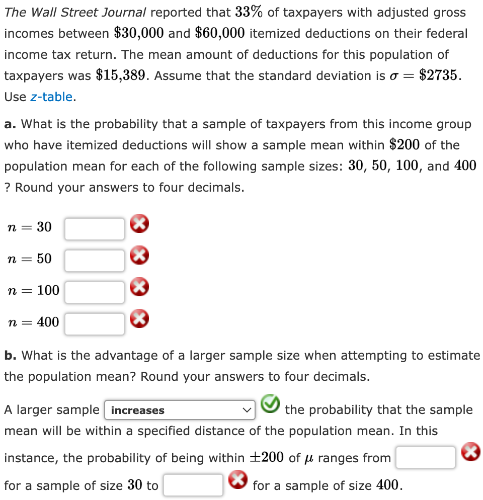 Instead of explaining where the money went, mr. The wall street journal reported that 33% of taxpayers with adjusted gross incomes between $30,000 and $60,000 itemized deductions on their federal income tax. Web statistics and probability questions and answers. Web the wall street journal reported that 33% of taxpayers with adjusted gross incomes between $30,000 and $60,000 itemized deductions on their federal income tax return.