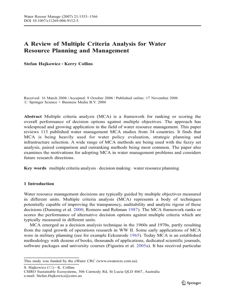 A Review of Multiple Criteria Analysis For Water Resource Planning and